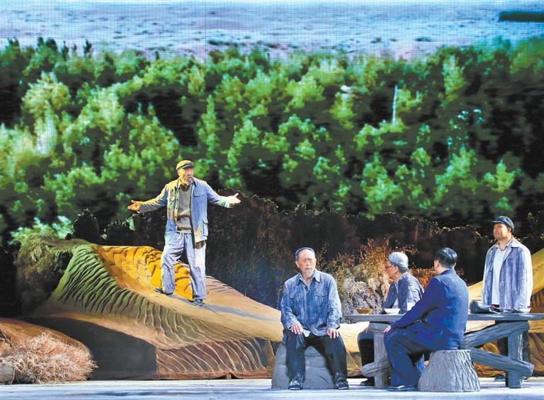 現(xiàn)實題材是話劇藝術(shù)的寵兒,在話劇進(jìn)入中國一百多年的時光中,現(xiàn)實題材創(chuàng)作占據(jù)相當(dāng)大的比例。在近當(dāng)代中國歷史的進(jìn)程中,話劇始終起著敢為天下先、針砭時弊的作用,但話劇又有其極其特殊的藝術(shù)框范。人們在觀看話劇時,仿佛就是在觀看自己的人生,觀看自己和身邊最熟悉的人們,這是話劇藝術(shù)獨(dú)具的極高的審美要求。尤其是現(xiàn)代題材的創(chuàng)作,稍有不慎便會陷入同質(zhì)化的僵硬模式,使舞臺藝術(shù)失去應(yīng)有的美感。話劇《八步沙》讓6個老漢成為舞臺聚光燈下的主角,體現(xiàn)了創(chuàng)作者們呼應(yīng)時代之需,為最普通的農(nóng)民寫生立傳的拳拳之心。6個老農(nóng)民談不上人們通常意識中的“美”,“治沙”這樣的故事也相對比較單調(diào),不大容易出彩,而創(chuàng)作者們以八步沙這個真實的地名作為劇名,以“六老漢”治沙這個真實的事件作為全劇的敘述內(nèi)容,卻能宕開一筆把特定的外部環(huán)境與人物的內(nèi)心世界巧妙地融為一體,為全劇注入了濃郁飽滿的戲劇情境和情感,使這部話劇有了獨(dú)屬于自己的一份力度、一份無法替代的光彩。全劇的情節(jié)一曲三折,以小見大,當(dāng)黑壓壓的沙塵暴鋪天而來的時候,當(dāng)六老漢在嚴(yán)酷的環(huán)境中吃盡苦頭,摸索出“一棵樹,一把草,壓住沙子防風(fēng)掏”的寶貴經(jīng)驗,使漫無邊際的沙漠終于出現(xiàn)一抹綠色,繼而眼看著一棵又一棵綠樹成活成林,終于成為一片綠洲的時候,我相信觀眾的心也被藝術(shù)琴弦撥動,始終被劇情牽著走,為劇中人物的命運(yùn)擔(dān)心、懸心、痛心、開心,從中深深地感受到劇中所蘊(yùn)藏的豐富內(nèi)涵和它所傳達(dá)出的真切意趣。