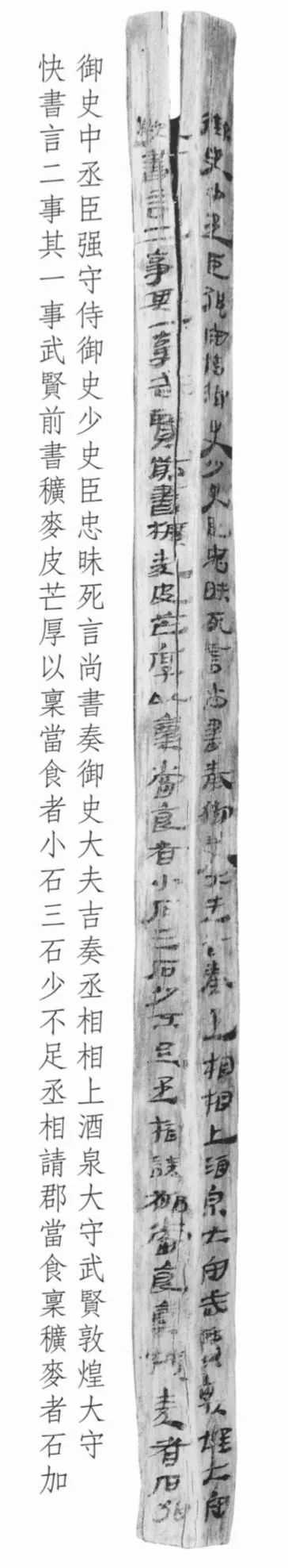 此簡為漢宣帝回復(fù)酒泉太守“辛武賢”和敦煌太守“快”奏疏的恩準(zhǔn)詔書,簡文記載的是皇帝詔書中對兩太守奏疏內(nèi)容的復(fù)述。從簡文內(nèi)容看,酒泉太守辛武賢和敦煌太守快給朝廷的奏疏主要涉及兩件事情:一是辛武賢認(rèn)為作為糧草的穬麥因皮厚芒長,如按規(guī)定每人發(fā)放小石三石,會造成實(shí)際數(shù)量的不足,所以他請求皇帝每石加發(fā)若干。另一件事顯然是敦煌太守快的上書,但文字未能容納于此簡,故不得而知。