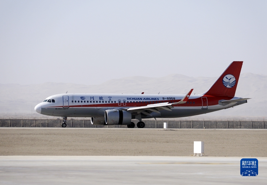 3月26日,由四川航空公司執(zhí)飛的成都至敦煌往返直達(dá)航線正式通航。這是首航航班降落在甘肅敦煌莫高國際機(jī)場。新華社發(fā)(張曉亮攝)