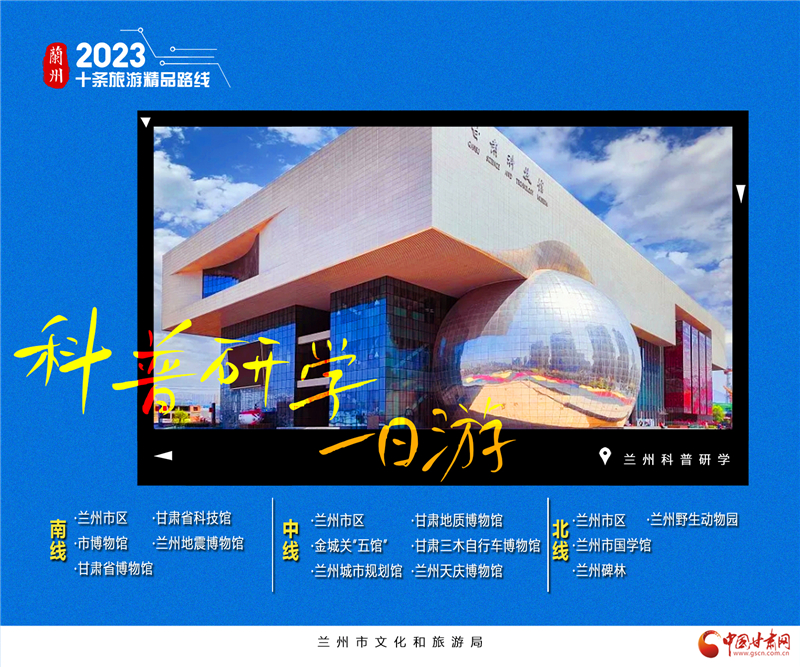 6.蘭州科普研學(xué)1日游。蘭州博物館有很多,可謂是品類(lèi)齊全。綜合類(lèi)博物館如省博、市博自不用說(shuō),中國(guó)旅游標(biāo)志“馬踏飛燕”原件陳列真的不想去看看?各類(lèi)專(zhuān)門(mén)博物館也是非常齊全,秦腔博物館、黃河橋梁博物館、城市規(guī)劃館、自行車(chē)博物館、地震博物館等……“蘭州科普研學(xué)1日游”三條線,分別為南線、中線和北線。