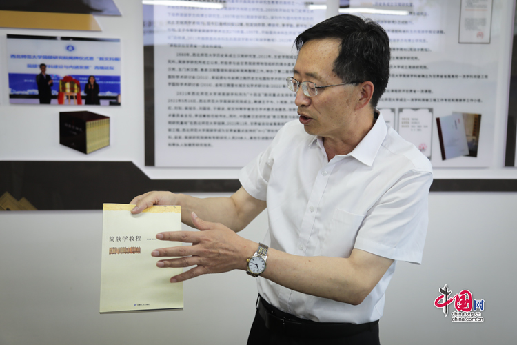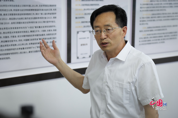 7月31日,西北師范大學(xué)歷史文化學(xué)院院長、博士生導(dǎo)師劉再聰向“簡牘中國”媒體團(tuán)介紹簡牘學(xué)學(xué)科建設(shè)情況。中國網(wǎng)記者 鄭偉 攝