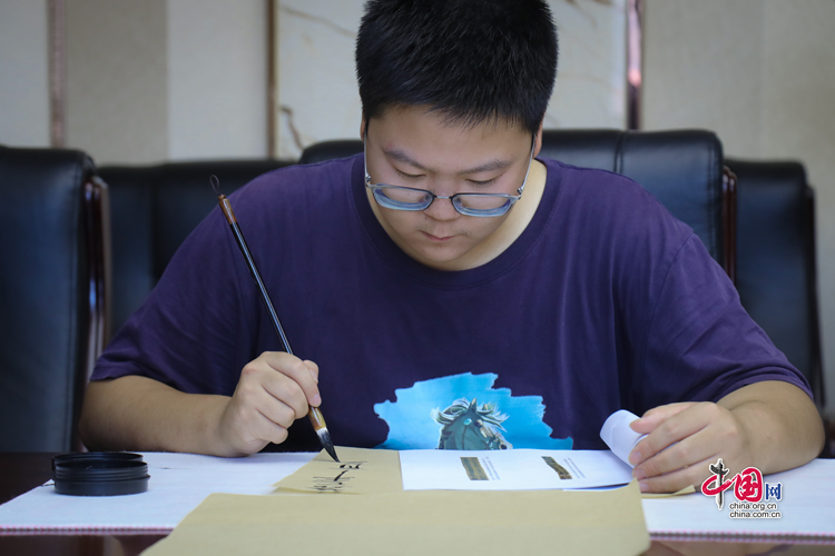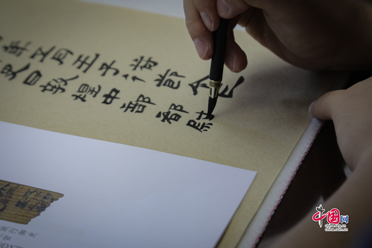 7月31日,蘭州大學(xué)古文字學(xué)強(qiáng)基計(jì)劃同學(xué)正在臨摹簡牘。中國網(wǎng)記者 鄭偉 攝