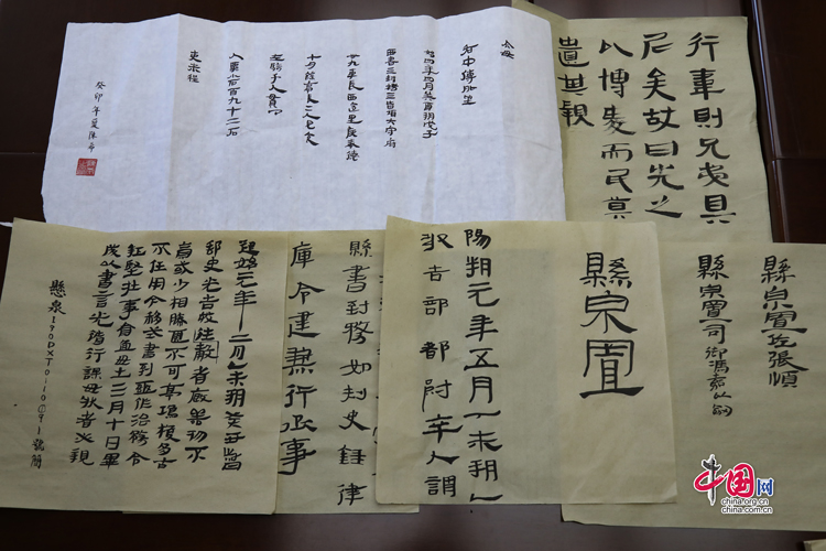 7月31日,蘭州大學(xué)古文字學(xué)強(qiáng)基計(jì)劃同學(xué)展示臨摹簡牘的書法作品。中國網(wǎng)記者 鄭偉 攝