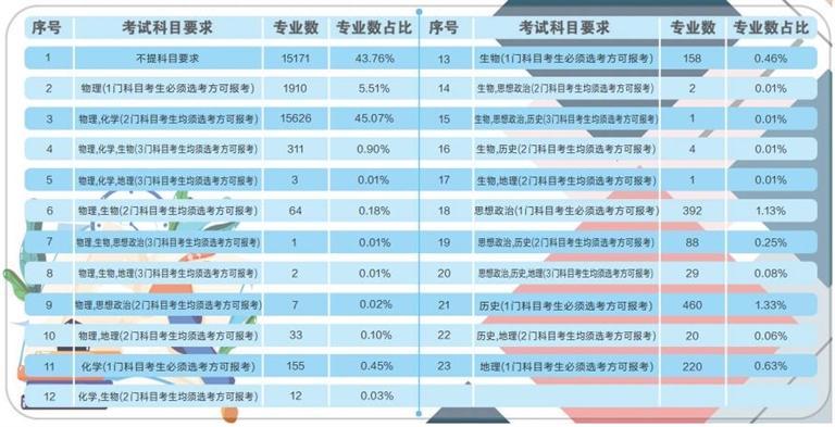 據(jù)了解,根據(jù)《甘肅省深化高等學(xué)??荚囌猩C合改革實(shí)施方案》要求,從 2021年秋季入學(xué)的普通高中一年級學(xué)生開始,實(shí)行基于統(tǒng)一高考和高中學(xué)業(yè)水平考試成績、參考綜合素質(zhì)評價的高??荚囌猩J?。到2024年,基本形成分類考試、綜合評價、多元錄取的高??荚囌猩贫?,健全促進(jìn)公平、科學(xué)選才、監(jiān)督有力的高校考試招生體制機(jī)制。此次在我省報送選考科目要求的高校專業(yè)共計(jì)64092條,其中本科專業(yè)34670條。專業(yè)選考科目要求共有23種組合,其中不提科目要求的本科專業(yè)數(shù)量占本科專業(yè)總數(shù)的43.76%,含物理科目的占比為51.79%,含化學(xué)科目的占比為46.46%,含歷史科目的占比為1.74%,含“物理+化學(xué)”科目的占比為45.98%。