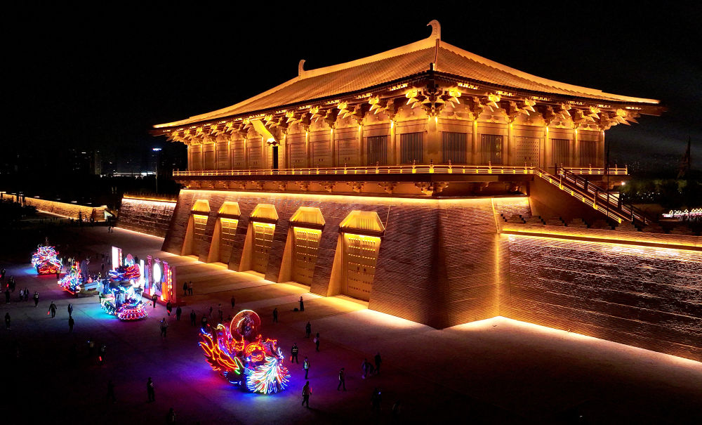 巡游彩車從西安大明宮國家遺址公園丹鳳門前駛過(2023年9月30日攝,無人機(jī)照片)。新華社記者 劉瀟 攝