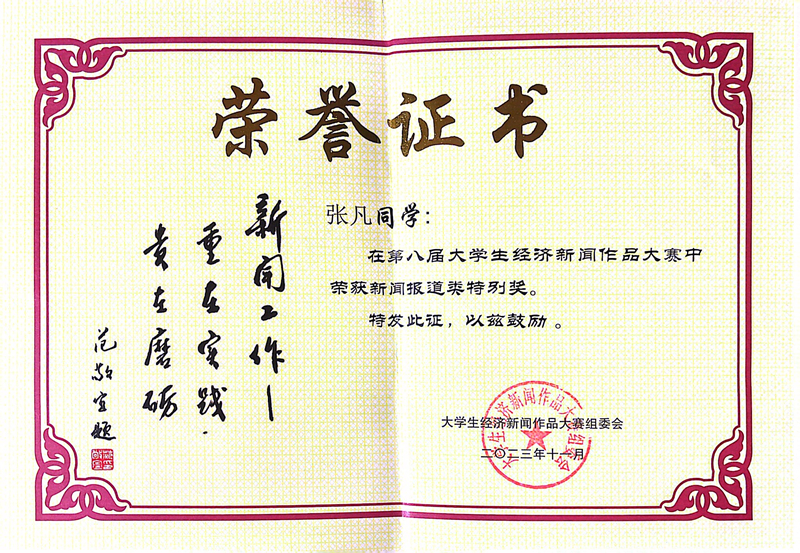張凡獲獎(jiǎng)榮譽(yù)證書