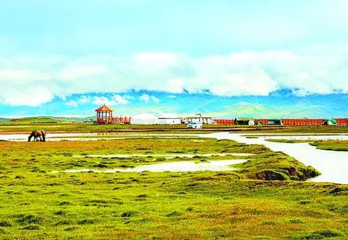 河曲馬場景區(qū)以熱爾欽濕地草原、熱爾欽湖為主要自然景觀,目前建有神駒廣場、高原馬術活動基地、步行街、親水濕地觀光平臺、星空帳篷酒店、房車帳篷營地、熱氣球觀光基地、瑪緹高端酒店等配套附屬設施。大自然在這里集高原湖濱濕地、沼澤濕地、高寒草原于一體,構成了復合型的別樣景觀。