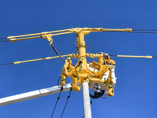 作業(yè)現(xiàn)場,嚴寒逼人,但準備井然有序。該公司相關(guān)負責(zé)人提前組織現(xiàn)場勘查,制定“三措一案”,反復(fù)預(yù)演操作流程。絕緣斗臂車、絕緣手套、遮蔽毯等器具逐一檢查確認,確保萬無一失。上午11時10分,兩名作業(yè)人員穿戴好絕緣防護裝備,乘絕緣斗臂車緩緩升至12米高空,逐步對導(dǎo)線、橫擔(dān)、桿塔等帶電部位進行絕緣遮蔽,構(gòu)建起安全作業(yè)屏障。隨后,他們依照標準化作業(yè)指導(dǎo),沉穩(wěn)細致地完成三相引流線的搭接工作。