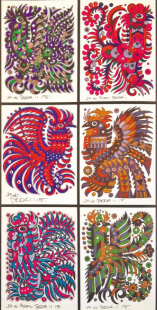 動物系列繪畫,從扎實(shí)而靈動的速寫與設(shè)計(jì)稿直至近似完美的正式作品,都蘊(yùn)含了畫家捕捉物象的執(zhí)著與機(jī)敏,提煉造型的睿智與不懈,有了心血與摯愛的投入,那成竹在胸別具一格的小貓小狗小豬小鵝小猴也就躍然紙上呼之欲出了。在長方形的深色卡紙上,那銀色勾勒的活靈活現(xiàn)的百魚圖,讓我們沉醉于湛藍(lán)的海洋世界;在四方形的白色鏡框中,那七彩斑斕的百雞圖,讓我們迷戀于鄉(xiāng)間的濃郁風(fēng)情;還有鞠躬盡瘁一生奉獻(xiàn)膂力雄強(qiáng)的牛群系列,馳騁千里挾帶雄風(fēng)英姿勃勃的駿馬圖騰……