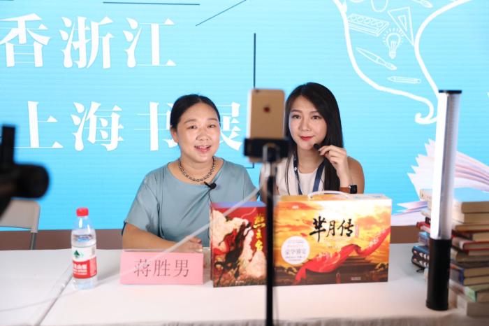 作家蔣勝男在上海書展與網絡達人直播中。浙江文藝出版社供圖