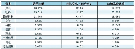 從細(xì)分市場(chǎng)情況來(lái)看,中小學(xué)幼兒園教材、法律、傳記、學(xué)術(shù)文化、教輔和少兒類(lèi)呈現(xiàn)正向增長(zhǎng),其余類(lèi)別均表現(xiàn)為同比負(fù)增長(zhǎng)。