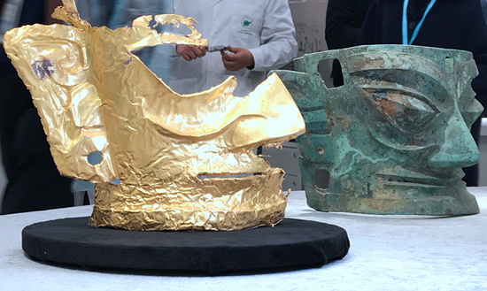 三星堆遺址新出土的金面具(左)。紅星新聞 王明平/攝