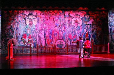 《永樂宮紀事》創(chuàng)造性地將蒲劇、歌劇、舞劇、話劇、音樂劇等多種藝術(shù)形式有機結(jié)合、融為一體,在充分利用地域文化元素的同時,還將珍貴的永樂宮壁畫與現(xiàn)代聲光電等舞臺技術(shù)有機結(jié)合,營造出絢麗多彩的舞臺效果。