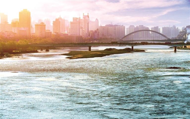 河分南北,勢接?xùn)|西。舒寧陜之博帶廣袖,帶青藏之峨冠雪衣。山逶迤而續(xù)祁連,水澎湃而瀉右?guī)?。匯洮湟之迤邐,有容乃大;與華夏之康莊,唇齒相依??睾游髯呃?,自古而始;俯渭涇秦川,由朝至夕。綴葫蘆狀岸渚坪灘,幾多古渡;依膏腴處坡谷盆地,即就蕃息。筑虹蜺經(jīng)百年,鐵橋第一;盤游龍於今朝,立交數(shù)十。去病鞭地,五泉山勝于秀逸;永誠建院,白塔寺高于云齊。指點(diǎn)九州,大禹登九州之臺;漂流黃河,洋人恐招手之磯。草覆馬銜而能牧,林茂興隆云可棲。繞營盤高嶺排五,峙雄關(guān)沿河有七。留千古名,白馬浪細(xì)聽湍流不息;鎖萬代鑰,金城關(guān)只留站牌不奇。雷壇留碑,金天觀曾殿宇壯麗;華林無寺,節(jié)能燈照幽路石基。湍流黃河,九曲回腸依然東去;水轉(zhuǎn)輪盤,十方高地亦滿紛披。