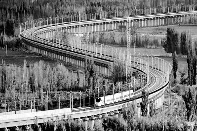 伴隨改革開放大潮,中國發(fā)展日新月異,高鐵、快遞、“天眼”望遠鏡、粵港澳大橋等新事物都被詩人們?nèi)谌朐娦小D為行駛中的蘭新高鐵列車。新華社發(fā)(蔡增樂攝)