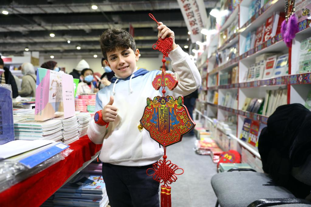 2月4日,在埃及開羅舉辦的開羅國際書展上,一名男孩在中國圖書展位展示春節(jié)裝飾。新華社發(fā)(艾哈邁德·戈馬攝)