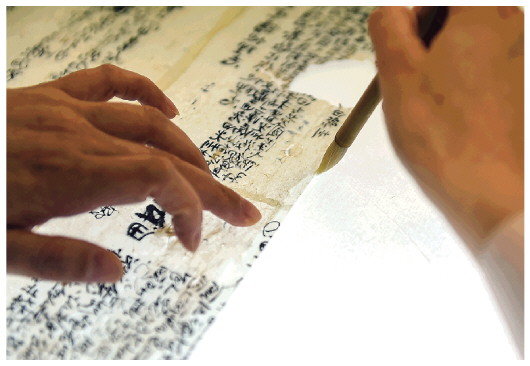 ▲5月17日,在安徽博物院文物科技保護(hù)中心紙質(zhì)文物修復(fù)室,工作人員對古籍文物進(jìn)行補全。新華社記者周牧攝
