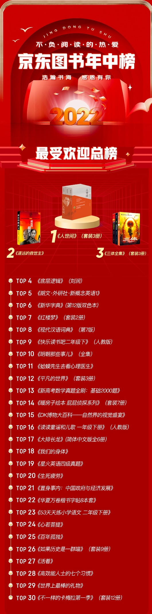 近日,京東圖書(shū)發(fā)布了2022年中圖書(shū)暢銷榜,包括總榜、新書(shū)榜,以及文學(xué)、經(jīng)管、童書(shū)、社科、科技、勵(lì)志、生活、藝術(shù)、文教、考試等10個(gè)類別的分榜,每個(gè)榜單均有30種圖書(shū)入榜,入榜圖書(shū)總數(shù)超過(guò)300種。