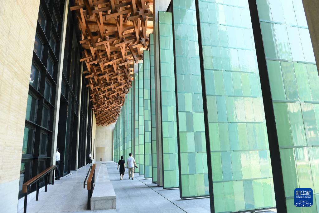 杭州國家版本館屋頂?shù)哪緲?gòu)和青瓷門扇相映成趣(7月23日攝)。