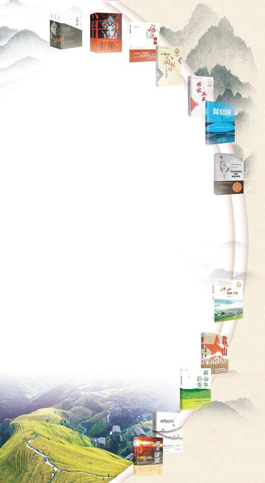 書影圖片從上至下依次為《人世間》《主角》《海邊春秋》《十八洞村的十八個(gè)故事》《國家溫度》《琵琶圍》《遠(yuǎn)去的白馬》《江山如此多嬌》《靠山》《新山鄉(xiāng)巨變》《西海固筆記》《重卡雄風(fēng)》(按出版時(shí)間排序)。何向陽 供圖;底圖為廣西龍勝各族自治縣龍脊梯田景色。韋吉陽 攝(人民視覺)