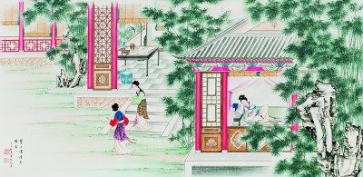 寶玉順腳一徑來到瀟湘館,信步走入,只見鳳尾森森,龍吟細(xì)細(xì),悄無人聲。走至窗前,一縷幽香從碧紗窗中暗暗透出。寶玉便將臉貼在紗窗上,往里看時(shí),耳內(nèi)忽聽得細(xì)細(xì)的長嘆了一聲道:“每日家情思睡昏昏。”譚鳳嬛繪