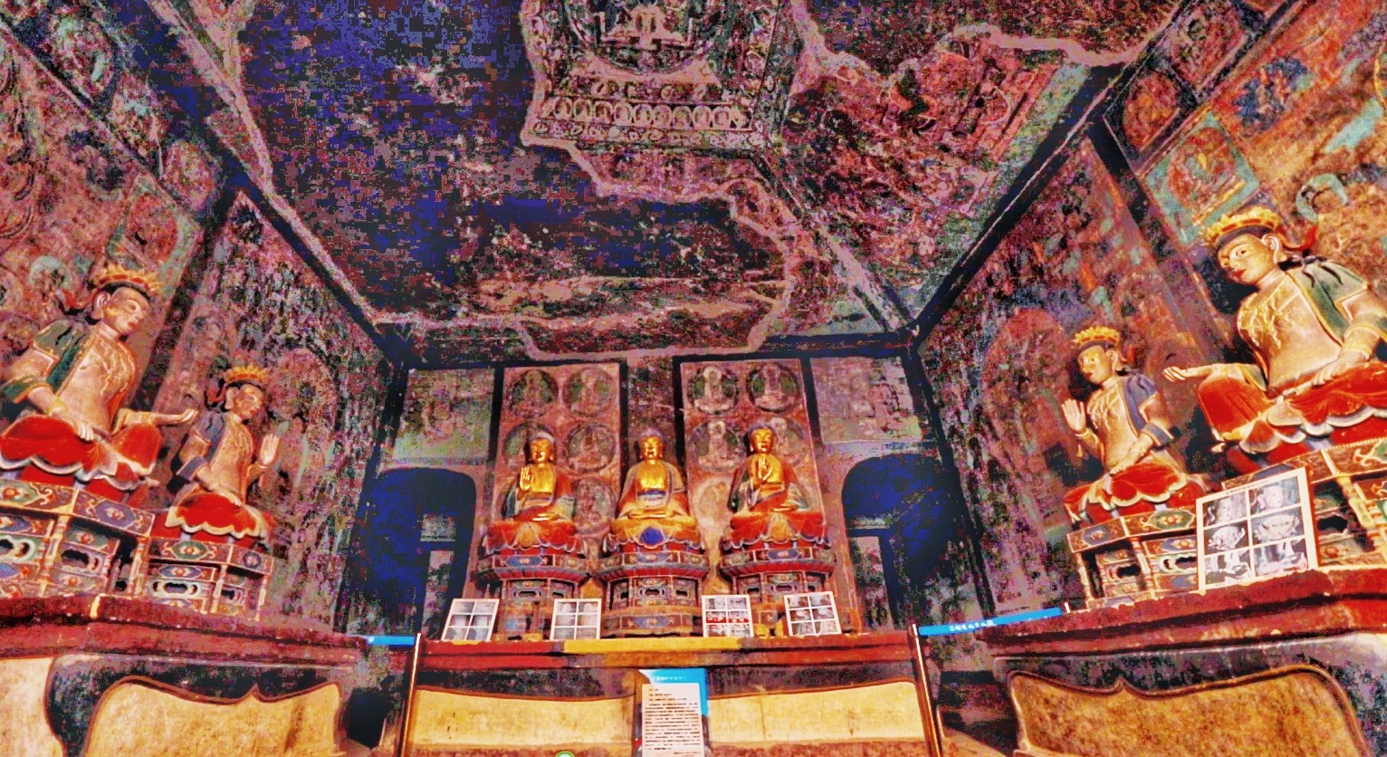 東千佛洞因地理位置相較于敦煌西千佛洞,故名東千佛洞,又因西夏7號窟前室東西壁對稱彩繪《接引佛祖》各一幅,故又名“接引寺”。初創(chuàng)于唐,五代、西夏、元、清各代增修,逐步形成較大規(guī)模的石窟群,現(xiàn)存23窟,以內(nèi)容豐富、技藝精湛的西夏壁畫稱絕于世,其密宗佛教壁畫填補(bǔ)了敦煌莫高窟壁畫藝術(shù)的空白。