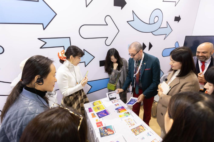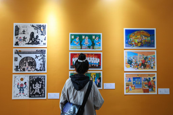 11月17日,參觀者在第十屆中國上海國際童書展現(xiàn)場(chǎng)觀看“2023金風(fēng)車國際青年插畫家大賽”參賽作品。