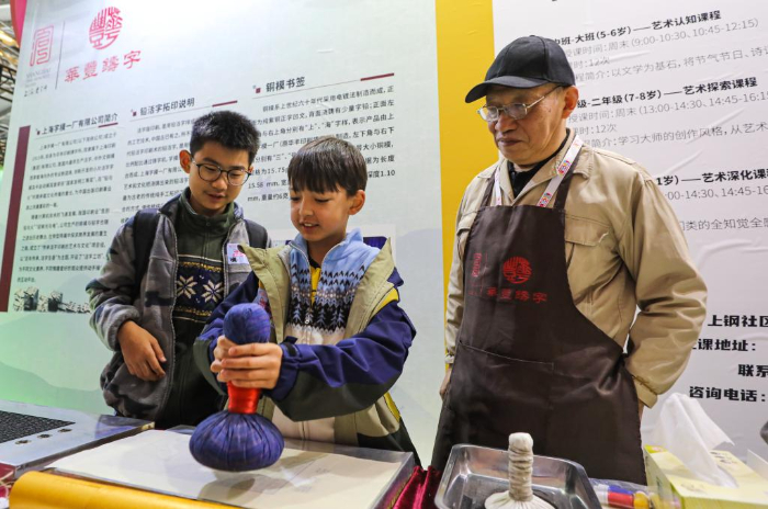 11月17日,參觀者在第十屆中國上海國際童書展現(xiàn)場(chǎng)體驗(yàn)活字印刷。