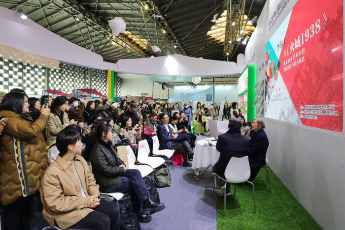 11月17日,藝術(shù)家蔡皋(右一)在第十屆中國上海國際童書展現(xiàn)場(chǎng)與書迷交流。
