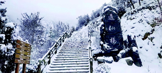 白雪覆蓋著天地間的一切喧囂,此時(shí),朝著山門向上望去,通天梯沒入天際,天與山的交界處一片蒼茫,分不清是云是煙,似乎上面真是仙境,讓人忍不住想要探尋。