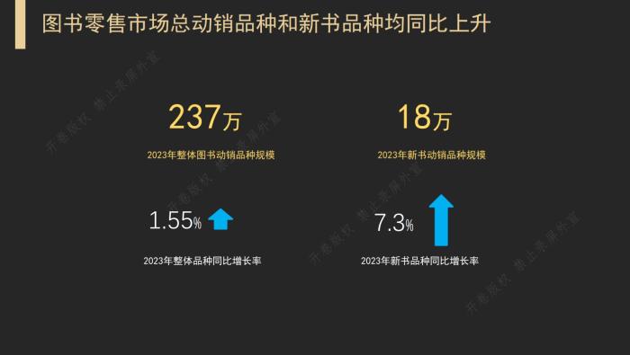上述《報(bào)告》顯示,2023年整體零售市場(chǎng)總動(dòng)銷品種達(dá)237萬種,同比上升1.55%,動(dòng)銷新書品種達(dá)18萬種,同比上升7.3%。
