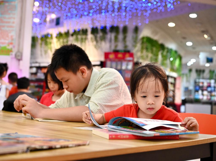 7月6日,福州新華書店鰲峰坊書城內(nèi)家長陪伴孩子讀書納涼。