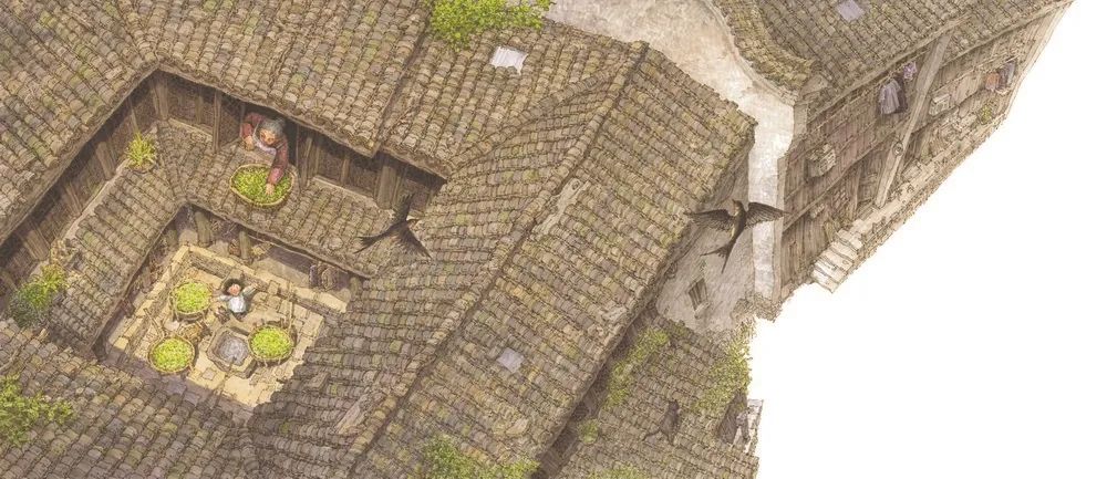 作為中國民居建筑繪本,《外婆家在江南》并不是專門講述江南民居建筑的知識繪本,而是將知識和故事巧妙交融,彌漫著濃郁的人文氛圍,流淌著深厚的情感意蘊。全書的文字構成一篇精美的散文,字斟句酌,凝練雅致,看似輕描淡寫,實則情深意長。作者以小女孩丫丫和外公外婆為主要人物,以行云流水的筆墨鋪展一家人從早到晚的一日生活,同時移步換景地展示江南民居的特色。畫家運用全景、中景和近景的鏡頭有節(jié)奏地進行頁面開合切換,既有整體的宏觀統攝,又有局部的細致凸顯。全書以具有江南特色的蠶事和休閑為線索,自然過渡和連綴起一系列勞動和生活的空間,河流、碼頭、廂房、天井、亭子間、閣樓、正房、店鋪、屋頂、馬頭墻、檐廊、戲臺、石板路……辛勤的日子蔓延于其中,生活的熱情洋溢于其中,溫厚的親情蘊藏于其中,意趣豐盈。