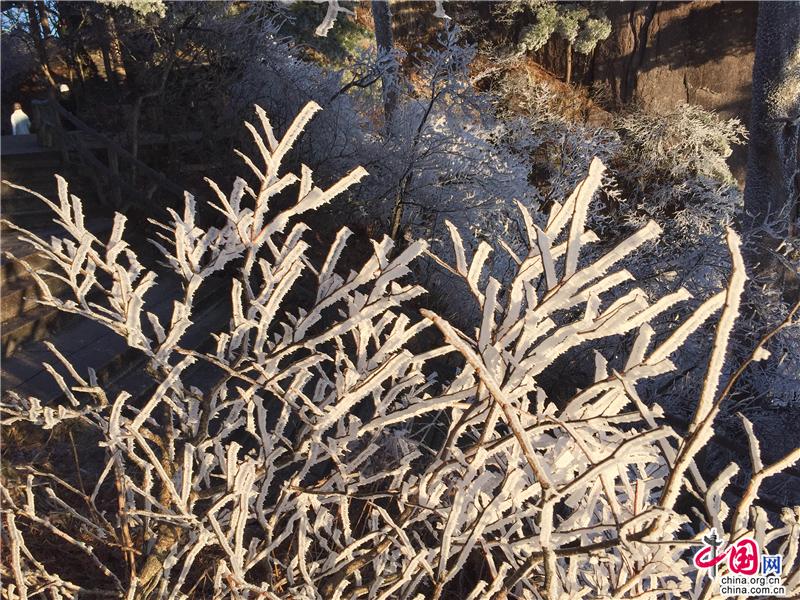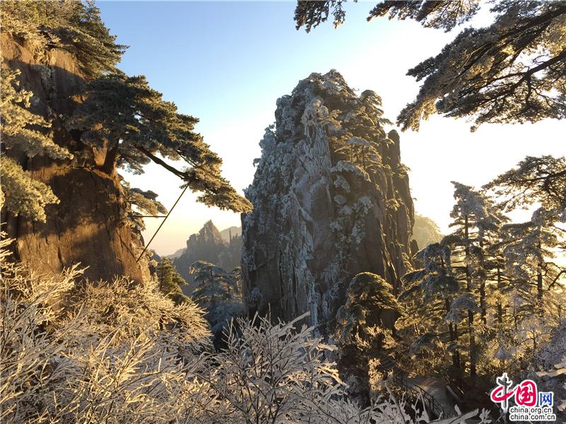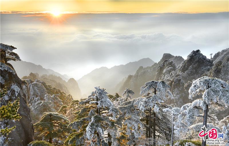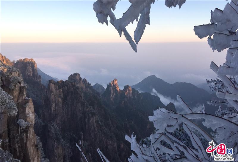 2019年最后一天黃山風(fēng)景區(qū),出現(xiàn)壯觀的日出、霧凇、云海景觀,到處銀妝素裹,冰雕玉砌,“一夜寒風(fēng)起,萬樹銀花開”,置身其間,仿佛進(jìn)入撲朔迷離的童話世界,給來山的游客帶來意外的驚喜。