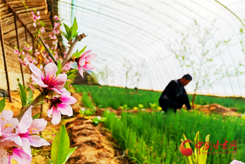 走進(jìn)敦煌市月牙泉鎮(zhèn)現(xiàn)代采摘園區(qū)農(nóng)民陶寶憲的溫室大棚,粉紅的桃花開(kāi)得正艷,濃濃春意撲面而來(lái),在花香的陪伴下,陶寶憲在大棚中辛勤勞作。