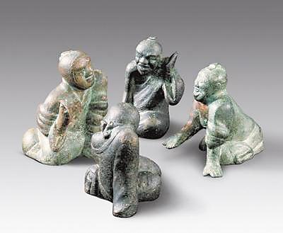 20世紀(jì)90年代甘肅靈臺(tái)縣出土了一組西漢銅質(zhì)博戲俑。俑最高9.2厘米,最寬9.7厘米。四俑相向跪坐,身著高領(lǐng)長(zhǎng)服。其中二人頭挽發(fā)髻,二人以寬巾裹頭。坐姿不同,形態(tài)各異,有的前傾仰首,有的垂臂塌肩;有的袒胸露膊,似在伸手探?。挥械那刃鄙?,默然扶膝靜坐。四俑的面部表情不同,刻畫(huà)細(xì)膩。他們或喜笑顏開(kāi),或嚴(yán)肅面對(duì),或凝神沉思,或略顯悲愁,神態(tài)活現(xiàn),精彩逼真,具有高超的藝術(shù)性和研究?jī)r(jià)值。