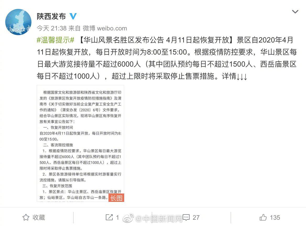 華山風景名勝區(qū)4月9日發(fā)布公告,宣布華山風景區(qū)4月11日起恢復(fù)開放。據(jù)@陜西發(fā)布 華山風景名勝區(qū)發(fā)布公告稱,自2020年4月11日起恢復(fù)開放,每日開放時間為8:00至15:00。