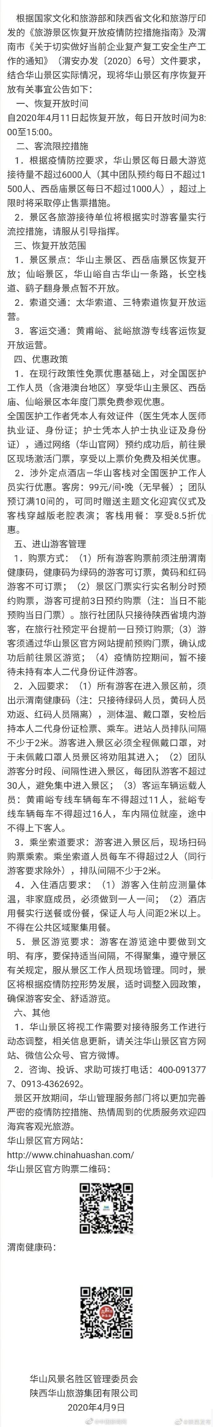 原標題:華山風景區(qū)11日起恢復(fù)開放 對醫(yī)護人員免門票