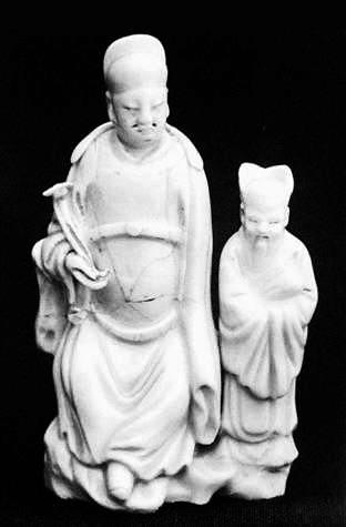 這件白瓷供養(yǎng)人像,為德化瓷人物像,釉面為純白色,色澤光潤(rùn)明亮。整件雕塑由兩個(gè)人物構(gòu)成,一大一小,一主一副。主像高13.7厘米,身穿典型的明代服飾,人物端坐在山石上,衣著瀟灑,神態(tài)自然從容,盡顯雍容華貴,而手執(zhí)如意則似乎暗示著他內(nèi)心的向往和追求。整個(gè)構(gòu)圖自然放松,給人一種輕松的感覺(jué)。小人物則是長(zhǎng)髯飄灑,笑容和藹可親,似乎帶著點(diǎn)職業(yè)習(xí)慣的微笑,雖然年紀(jì)比較大,但卻處于仆從的位置,手里還抱著一卷書(shū)。從一個(gè)側(cè)面烘托出了年輕主人的身份。