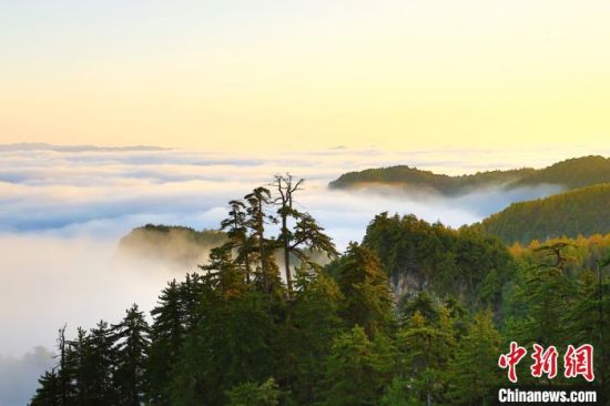 10月上旬,甘肅省定西市漳縣貴清山國家森林公園,朝陽在云層中若隱若現(xiàn),云遮霧繞的景象讓層巒疊嶂的山峰成為“云端村落”,仿若仙境。漳縣貴清山國家森林公園境內(nèi)原始森林遍布,森林、動植物資源十分豐富,貴清山被譽(yù)為隴中的“小華山”,是生態(tài)旅游勝地。