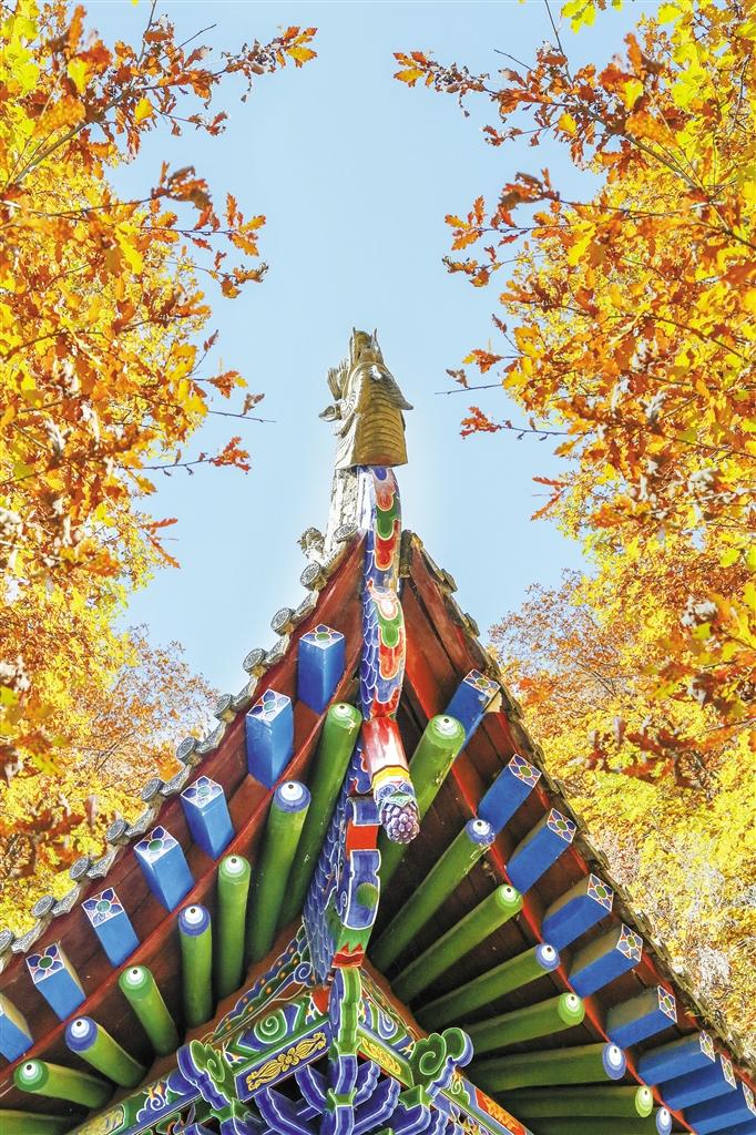 在秋天,興隆山不只有紅葉,與青岡樹相伴的還有山楊落葉松和樺樹,它們的枝頭像棲滿了黃蝶。一片片野山楊,在初陽的照耀下,純粹的本色的黃,如波浪流動,漫過一道道山脊,充盈一處處山彎。一片片白樺林,也是那么衷情,帶些褐色的黃在蒼翠的松柏云杉間,同掩映在峰巒間寺院道觀的翹角飛檐色調(diào)完全一致,格外讓人留戀。