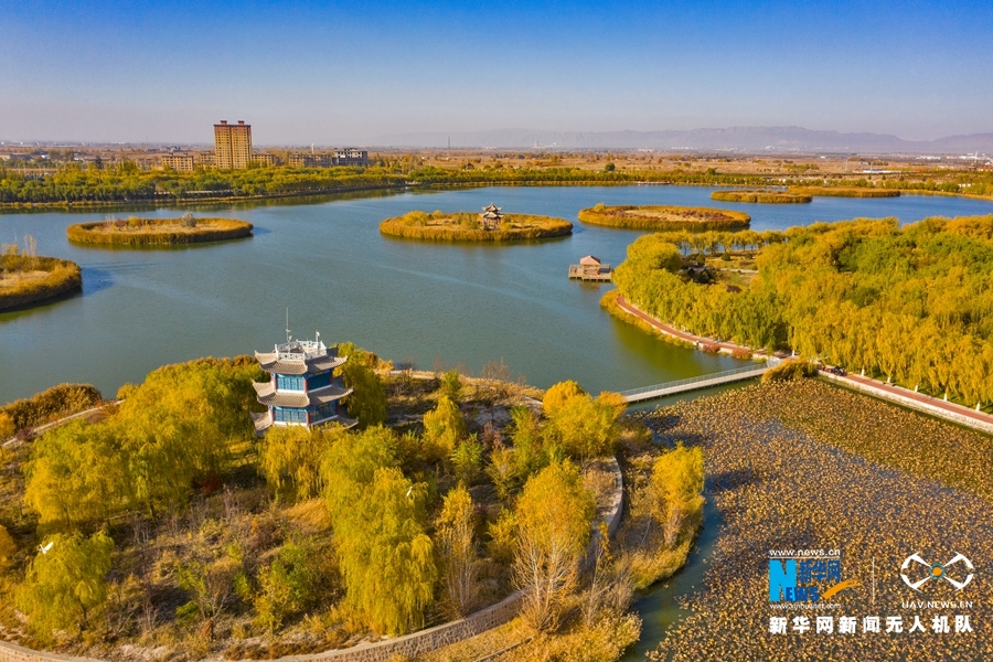 深秋時節(jié),國家4A級景區(qū)甘肅省張掖潤泉湖公園秋水依依,草木金黃,呈現(xiàn)出一幅斑斕畫卷。新華網(wǎng)發(fā)(成林 攝)