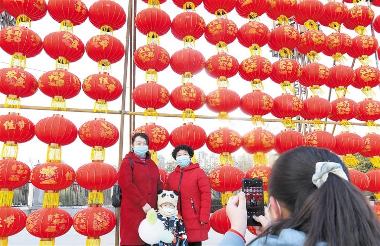 春節(jié)臨近,臨夏市街道、社區(qū)、公園張燈結(jié)彩,處處呈現(xiàn)一派喜慶祥和的節(jié)日氣氛。圖為市民們?cè)跂|郊公園紅燈籠前拍照。 記者 史有東 攝