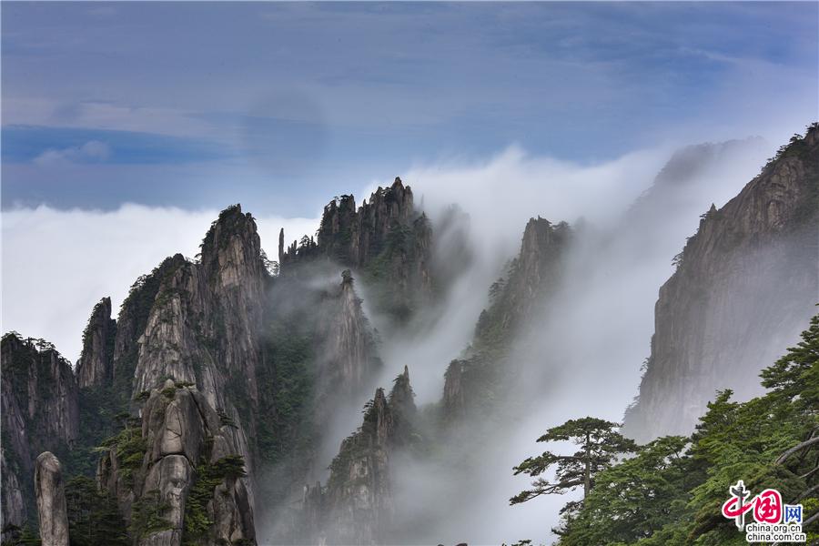 5月22日傍晚,雨后安徽黃山風(fēng)景區(qū)現(xiàn)壯觀的云海奇觀,見云海奔騰而來,越過北海的始信峰,沿著群峰傾瀉而下勢如瀑布之壯觀,在奇群、怪石和形態(tài)各異黃山松的作用下勾勒出一幅幅流動(dòng)的水墨畫;黃山不僅是云霧之鄉(xiāng),更是中國傳統(tǒng)水墨畫的天然的素材。(姚育青)