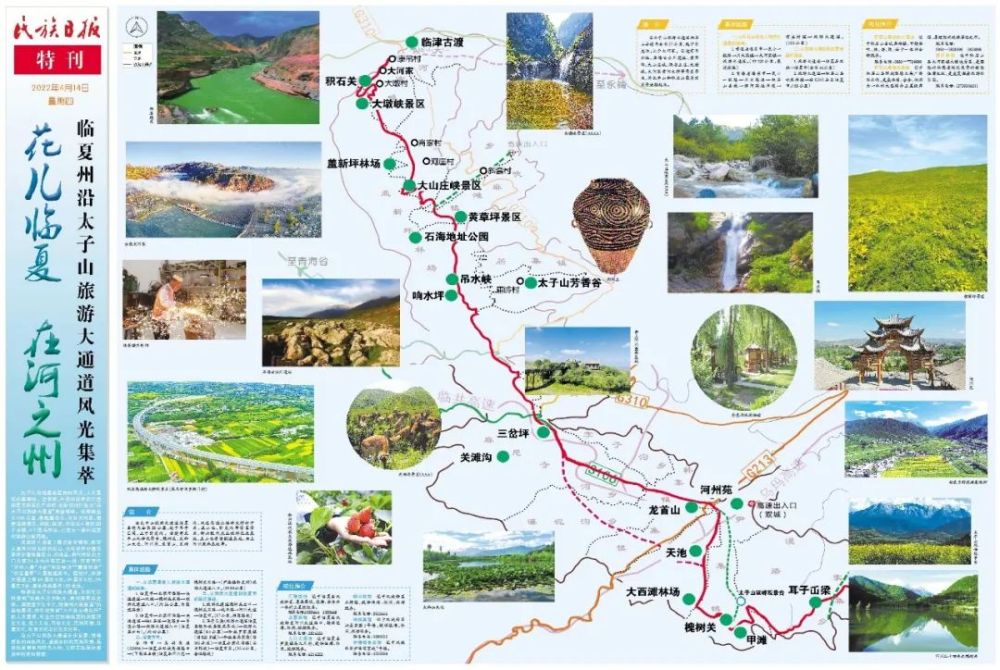 太子山沿線是臨夏自然風光、人文景觀的集萃地。近年來,州委州政府在打造臨夏文旅百億產(chǎn)業(yè)時,創(chuàng)新性地打造出“沿太子山旅游大通道”黃金線路。該線路全長286公里,南起蓮花山、北至大河家,涵蓋沿線康樂、和政、臨夏、積石山4縣的28 個鄉(xiāng)鎮(zhèn)、4個國有林場,已成為一條環(huán)臨夏州旅游公路網(wǎng)線。
