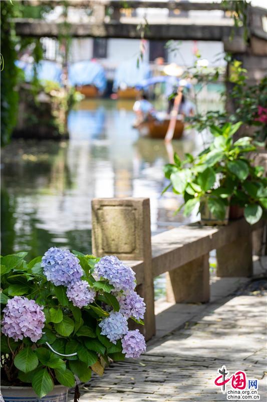 花團錦簇一詞大約是為繡球量身定制,微風(fēng)一曳,波光親吻一曳。藍紫開遍,彌漫的淡淡花香讓春天的信使忍不住沉溺其中,周莊的浪漫大抵關(guān)乎世間一切。