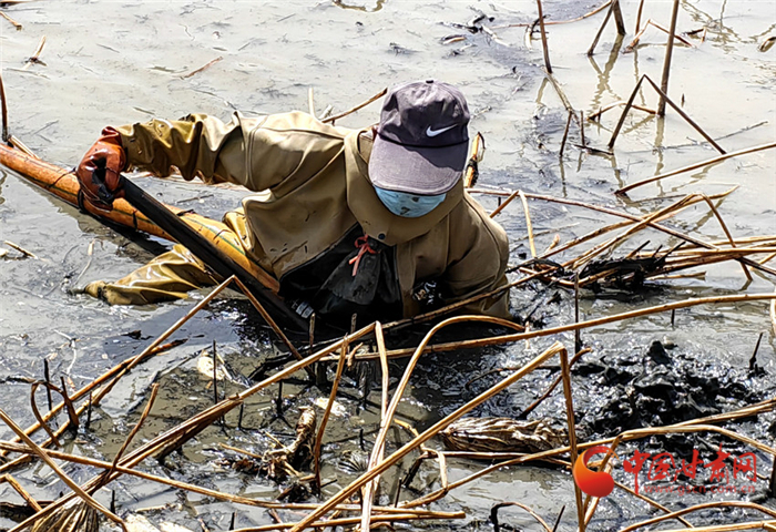 李愛芝是青城鎮(zhèn)東灘村村民,一大早她便和丈夫張興成換好了裝備,進入池塘里開始采摘蓮藕。張興成憑著手中高壓水槍“探路”,一步步艱難挪動,在淤泥里手腳并用尋找肥壯的鮮藕,幾乎整個身體都是趴在水面上,佝僂著腰,雙手盡力伸入淤泥,張興成的挖藕效率還算不錯,伴隨著一連串嫻熟的動作,不一會兒,一根根粗大的蓮藕漂浮在他身旁的水面上,李愛芝則將蓮藕身上的淤泥清洗干凈后裝拉回岸邊進行分裝。