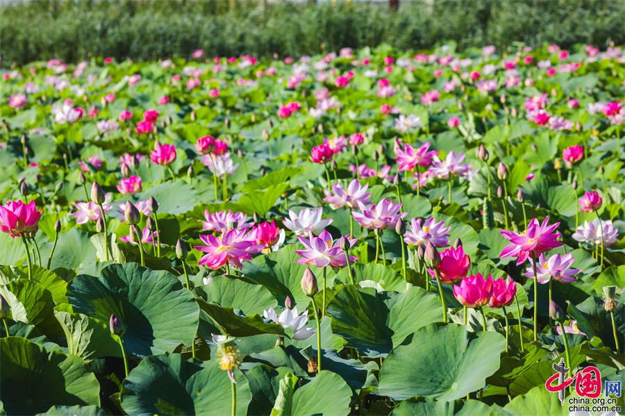 七八月份,正是荷花競相盛開的季節(jié),寧夏沙湖景區(qū)利用淺灘和鹽堿地種植觀賞性荷花,在湖東游線深處打造了西北沙漠旁的“萬畝荷花苑”,為景區(qū)夏日增添一抹韻味。成片的荷花在西北的驕陽下熠熠生輝,構(gòu)成“接天蓮葉無窮碧”的塞上秀美荷塘景觀。