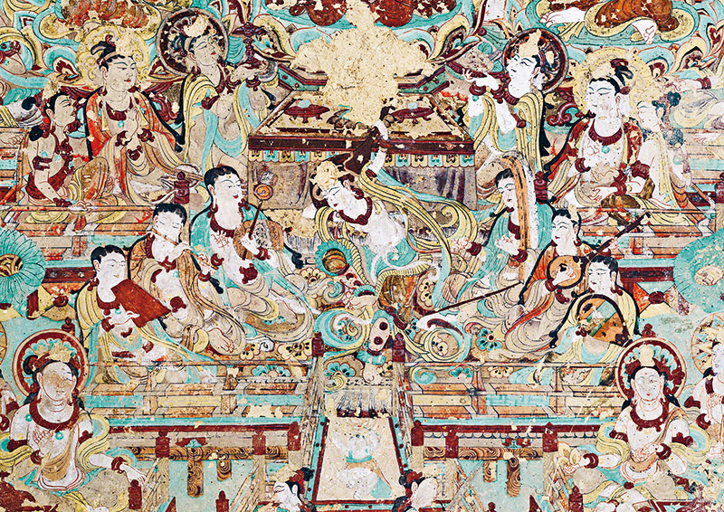 敦煌文化延續(xù)近兩千年,是世界現(xiàn)存規(guī)模最大、延續(xù)時(shí)間最長(zhǎng)、內(nèi)容最豐富、保存最完整的藝術(shù)寶庫(kù),是世界文明長(zhǎng)河中的一顆璀璨明珠,也是研究我國(guó)古代各民族政治、經(jīng)濟(jì)、軍事、文化、藝術(shù)的珍貴史料。圖為莫高窟第112窟南壁壁畫(huà)“反彈琵琶樂(lè)舞圖”。 敦煌研究院供圖