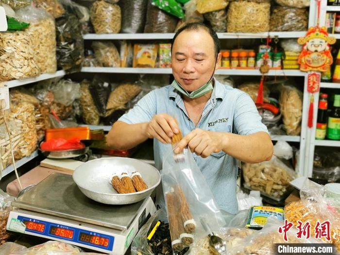 資料圖為廣東臺山富城市場內(nèi),一藥材檔的老板為顧客用密實(shí)袋打包參絲。 中新社發(fā) 李曉春 攝